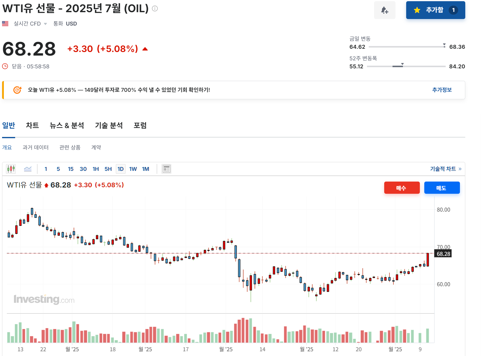 - WTI 유가(Oil): 68.28달러 (+5.08%) ⟶ OPEC 감산 유지 기대 + 미국 원유 재고 감소 발표 영향