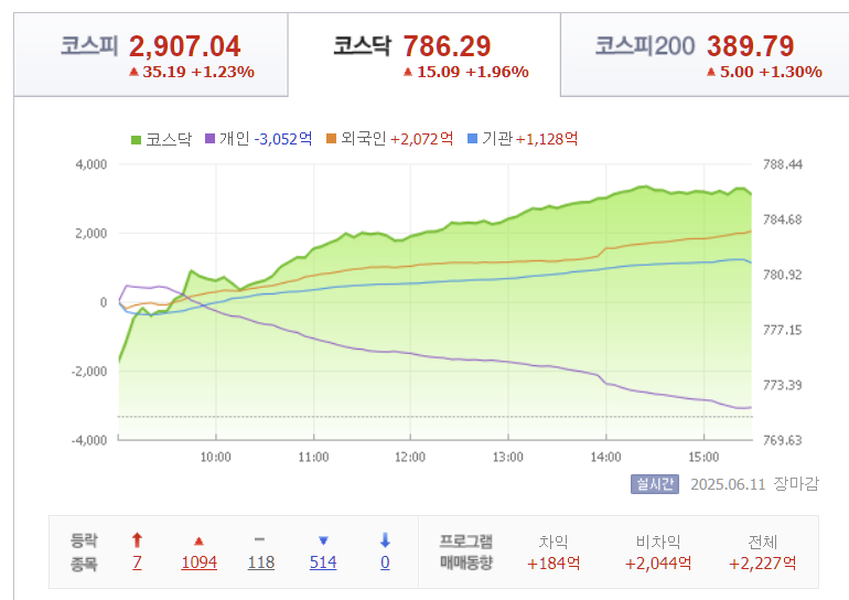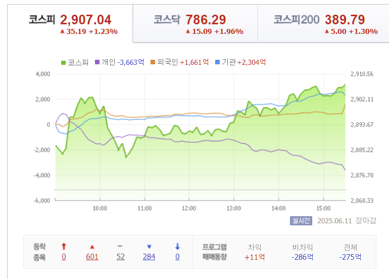 6월 11일 한국 증시는 코스피는 2,907.04pt(+1.23%), 코스닥은 786.29pt(+1.96%)로 종가 기준 고점을 갱신했습니다.