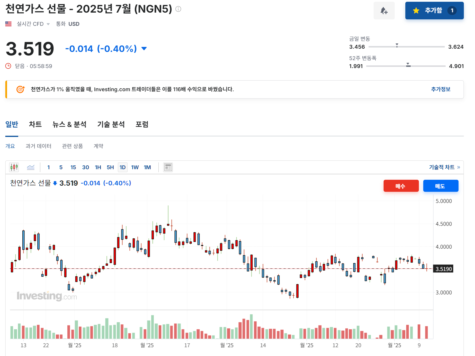 - 천연가스(NatGas): 3.519달러 (-0.40%) ⟶ 공급 과잉에 따른 하방 압력 재확인