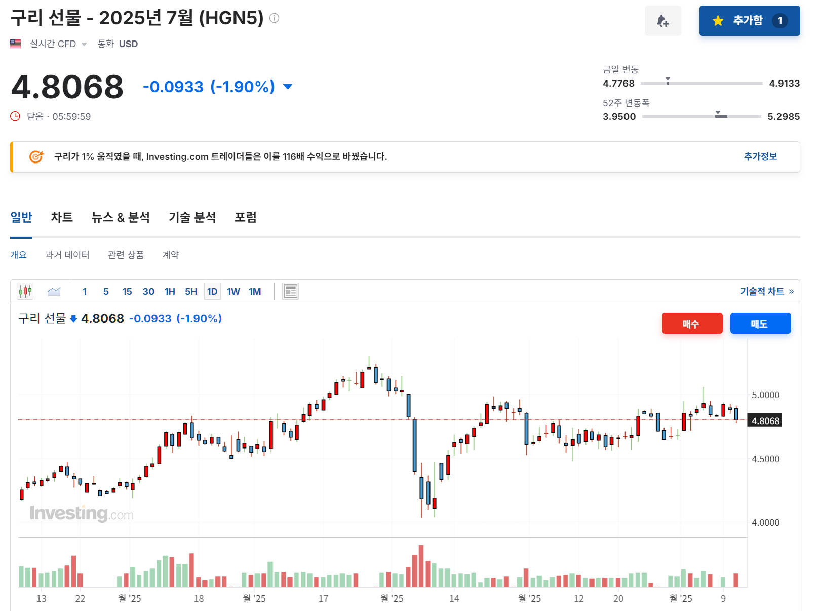 - 구리(Copper): 4.8068달러 (-1.90%) ⟶ 중국 수요 둔화 우려 지속, 기술적 이탈 압력