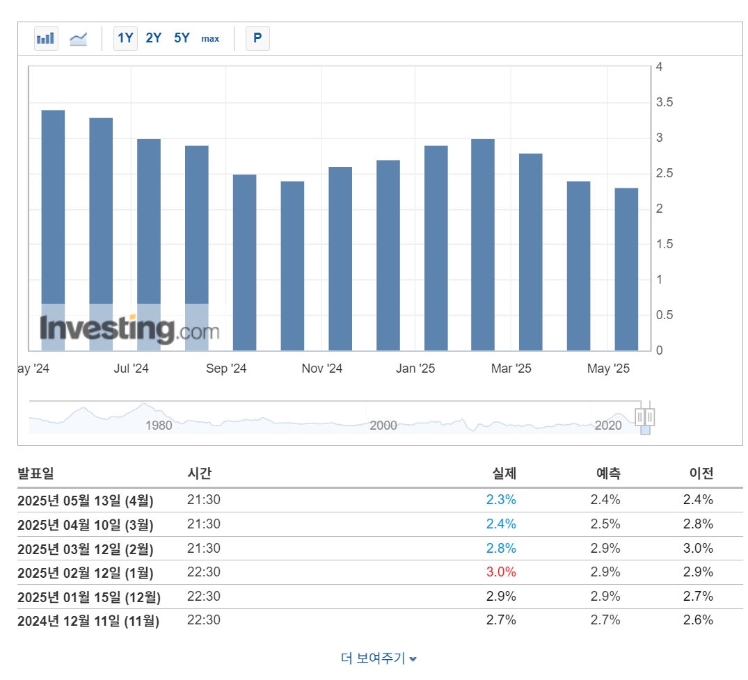 2025년 5월 13일 발표된 CPI에 따르면, 전년 대비 상승률은 2.3%로 시장 예상치(2.4%)를 소폭 하회했습니다. 이는 전월 수치였던 2.4%보다도 낮은 수치로, 인플레이션 둔화가 가시화되고 있음을 의미합니다.