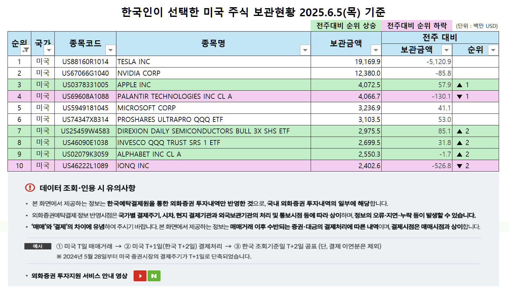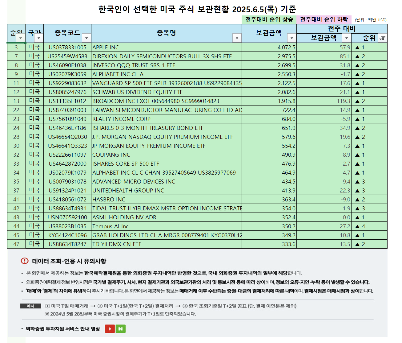 한국예탁결제원이 발표한 2025년 6월 5일 기준 자료에 따르면, 한국 투자자들이 보유한 미국 주식의 보관금액과 순위에 뚜렷한 변화가 감지됐습니다. 이번 포스팅에서는 보관금액 상위 TOP10, 급등·급락 종목, 월별 추이까지 일목요연하게 정리합니다.