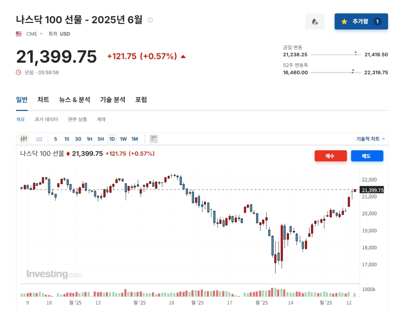 한국 시간 5월 15일 오전 6시 기준, 나스닥 100 선물은 21,399.75pt(+0.57%) 입니다. 이전 저점인 18,000p 부근에서 상승 추세가 시작되었으며, 현재는 기술적 저항선인 21,400선을 돌파 시도 중입니다.