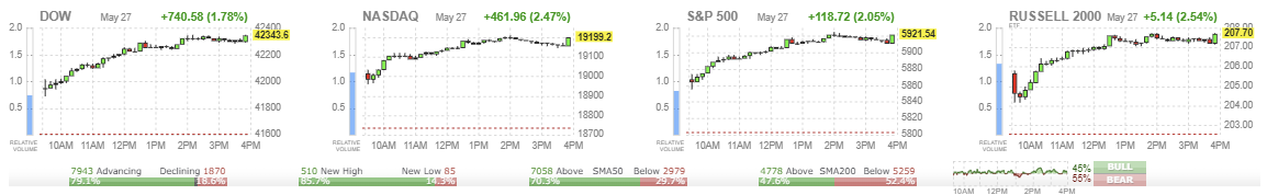 모든 주요 지수가 2% 내외로 상승하며 5월 반등 흐름을 이어갔습니다. 특히 기술주 중심의 나스닥이 강세를 주도했고, 러셀2000도 중소형주 중심의 투자심리 개선을 반영했습니다. 전일 하락에 따른 저가 매수세 유입과 함께 국채금리 안정, AI 관련주 기대감이 상승을 견인했습니다.