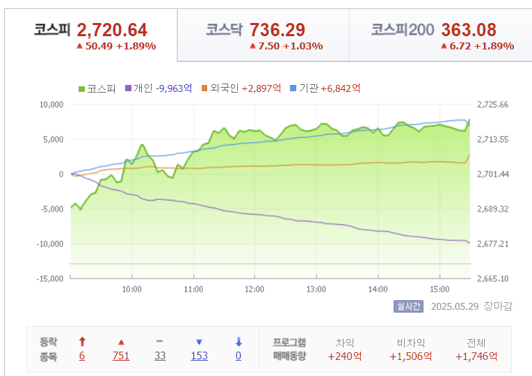 5월 29일 한국 증시는 전일에 이어 AI·반도체 기대감과 함께 기관 및 외국인 매수세가 집중되며 상승 랠리를 이어갔습니다. 코스피는 +1.89% 상승한 2,720.64pt, 코스닥은 +1.03% 오른 736.29pt로 마감했고, 대형주 중심의 코스피200은 +1.89% 상승하며 흐름을 주도했습니다.