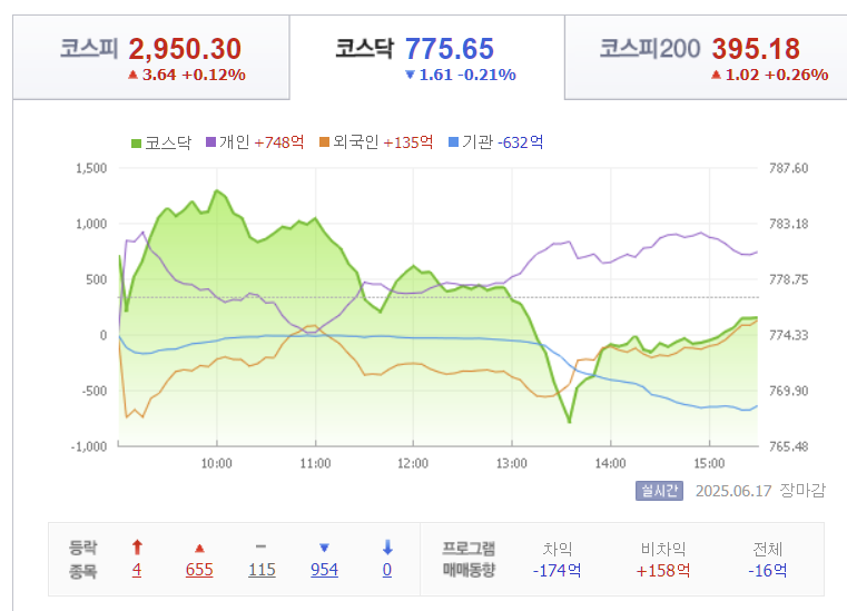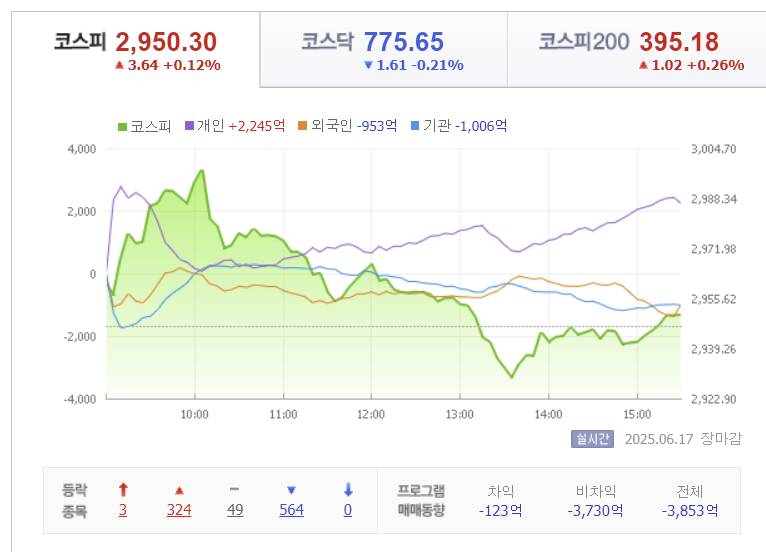 17일 한국 증시는 외국인 매도세의 영향으로 혼조 마감했습니다. 코스피는 전일 대비 3.64pt 오른 2,950.30(+0.12%)으로 소폭 상승했지만, 코스닥은 1.61pt 하락한 775.65(-0.21%)로 마감하며 차별화된 흐름을 보였습니다.